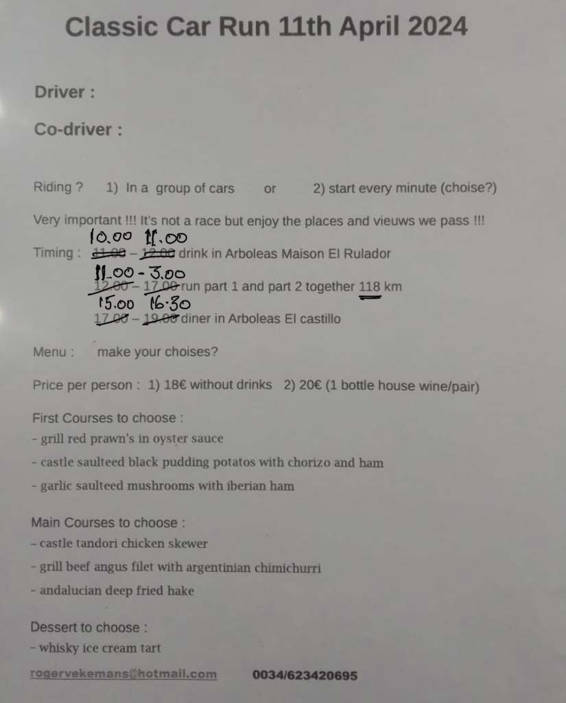 We start from Bar El Cortijo Bedar, Coffee Stop at Route 66 Retro Bar. Lunch is at El Mirador Restaurant in Nijar. Full details sent to all members via email all replies to Lynda via Email, whatsapps will be ignored.